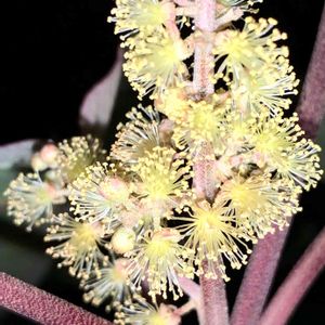 ① アカメガシワの花…これは雄花💕 🌿な〜るほど🤔 雌雄異株。枝先に長さ7〜20cmの円錐花序をだす。花には花弁はない。雄花は苞のわきに数個ずつつき、萼は淡黄色で3〜4裂する。雄しべは多数あり、花糸は長さ約3mm。