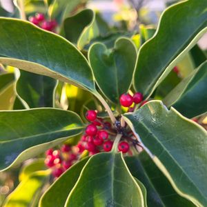クロガネモチの実 🏷️真っ赤な木の実 🏷️木曜日は木の実 🏷️縁起の良い木 参加します。 みどりの葉の中に赤色に熟した果実が手を伸ばす先に鮮やかでした😂 雌雄異株 語呂合わせ「苦労せず金持ち」の縁起の良い木