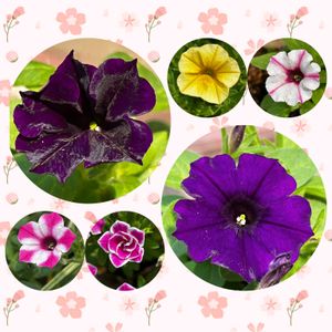 おはようございます☀ 新入り2つを含め、うちのペチュニア系勢揃い! 小さい丸から紹介しますね。 右上 新入りのスーパーチュニアビスタミニピンクスター。 その横 ミリオンベルイエロー。 左下 スーパーチュニアサクラフロート。 その横 スーパーベルダブルピンクリップル。 大きい丸は新入りのスーパーチュニアロイヤルベルベット。 ⬅️真っ黒でタグと違うと思ったら➡️2日目で普通の紫になりました。