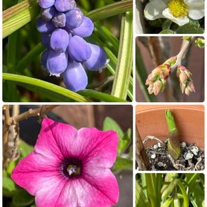 ベランダの植物🪴🌸 いつの間にか咲いていました😊 ムスカリや冬越しのスーパーチュニア サクラフロート、白い花はイチゴ。 蕾は、ブルーベリー🫐、シラン、フリージアです💐 ブルーベリーは、娘が敷地内に家を建てることになったので、昨年2月地植えを掘り起こし、枝を切り詰めて鉢植えにした物です。 昨年は実がつきませんでした😅 今年は行けそうです🫐😋