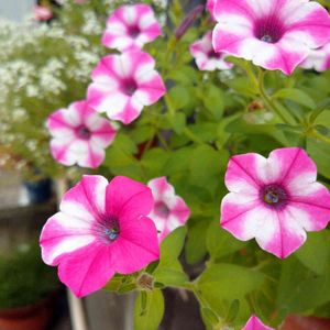 スーパーチュニア ラブローズプラス 6月27日に切り戻して、3週間で開花😄 梅雨空だったのに元気です。 後ろのサクラフロートは、夏バテしてます😅 ベランダから玄関に移動します😊