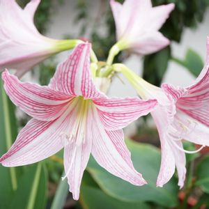 沢山増えたからお裾分け、と母から分けて貰ったシロスジアマリリス。ピンクのアマリリスと思い込んでいたら、赤に白い筋、葉っぱにも一筋入っています。 元々は妹が育てていたようですが、我が家でも増えて、今は2鉢。お天気が続いているおかげで次々と開花中。株分けしたもう1鉢は同じ場所にあるのに微妙に日当たりが違うのか、花芽は一つでまだ蕾です。お日様大好きなんですね。ちょっと可哀想な事をしました。 せっかく沢山咲くので、満開になったら玄関先にお引っ越ししてお披露目します。