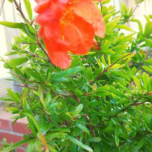 こんばんは🌕 ミニザクロの花です。 ミニがあることも 花が朱色であることも 知りませんでした😅