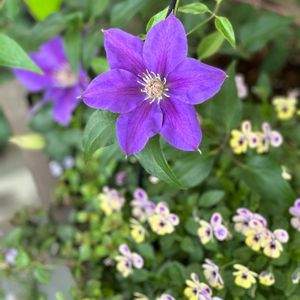初のクレマチスが咲きました✨ 紫色が綺麗〜😍 夢紡ぎもまだ元気に咲いていて、コラボも成功!