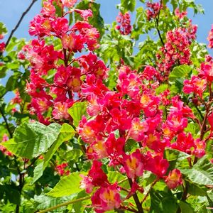 お散歩コースの街路樹に咲いていた、鮮やかな「紅花栃の木(ベニバナトチノキ)」でおはようございます🩷🍃🌳🍃🩷 20M近い樹高で天に向かって勢いよく伸びて咲く様は、実に存在感たっぷりでした😃❣️ "ベニバナトチノキ"は、北米原産のアカバナアメリカトチノキとヨーロッパ原産のマロニエを交配して作られた比較的新しい園芸品種だそうですね🌱✨ 日本産の栃の木と比べると、花色がより鮮やかで発色があり、若木のうちから花付きにも優れているようです。 ー花言葉は、「贅沢」、「天才」…他。