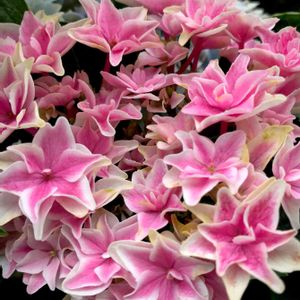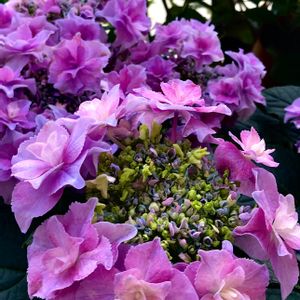 毎日更新紫陽花シリーズ番外編2 💠クウカイ💠 クロウさんへ、去年のクウカイ写真です💠 大栄花園さんの紫陽花のなかでは、繊細でちょっと育てにくい方なのでは?と私は思ってます。 花は白地で薄紫が中央から入り、咲き進んでも色は広がり切らずに中心の色が線を引いたように濃くなっていく感じでした。 装飾花はフリンジ入りの八重、両性花はゴージャス❣️です😄
