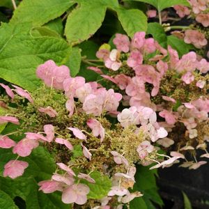 柏葉アジサイ 花色が白からピンクに変わってきました かわいい🩷 秋には葉が紅葉 楽しみ〜