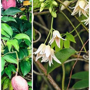 おはようございます😊 🏷 今日のお花ムベ🤍 ①② 4月に咲いたご近所さんの素敵なムベ🤍 ③④⑤ 秋の盆栽展のムベです❣️