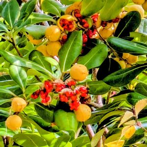 1️⃣ピラカンサ *今日のお花* 3mくらいもある巨木でした 2️⃣トベラ 扉・海桐 3️⃣シロダモ 4️⃣? 散歩道にて 赤い実❤️を集めてみました
