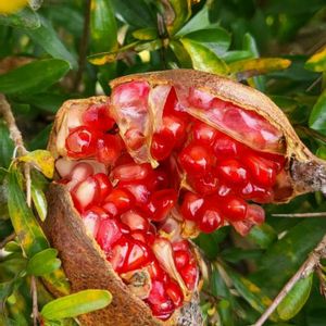 🌸ザクロの実🌸 直径6〜10cmほどの丸い果実で、熟すと果皮が自然に裂けます。 中には、ルビーのように輝く赤い果肉の粒(仮種皮)がぎっしり詰まっています。 一つの果実に最大で800粒もの果粒が含まれることもあります。 食感と味: 果粒は「プチプチ」とした独特の食感で、噛むとみずみずしい果汁が弾けます。 さわやかな甘みと酸味のバランスが特徴で、品種によって味わいは異なります。 果粒の中心には硬い種子がありますが、これごと食べられます
