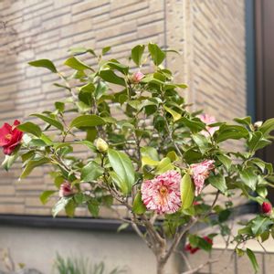 実家のお花たち No.4 斑入りツバキ𓏸𓈒❤️𓈒𓏸 元気モリモリで、ドッサリ花をつけています。 重そう💦 風通し・日当たりが良いので、スクスク育っている感じ。 🏷月曜日は元気色の花 参加させていただきます