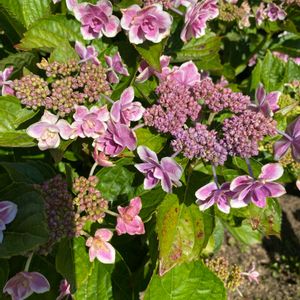 おはようございます。 6月に咲いて剪定しました。 2ヶ月半経過している 紫陽花こんぺいとう。 不細工ですが、ピンク花が、額紫陽花風に、咲いています。 株全体に、花芽が、ついていますが、咲くのかは、わかりません。