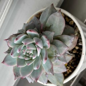 初登場の女雛です✨ 殖えやすいと聞いて、春に大きめの鉢にドンと植えました😆 なかなか動きがなく、今朝覗いたら縁が紅くなり、少し大きくなってきたようです。いよいよ動き始めたかな🎶