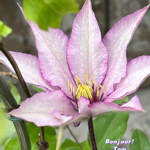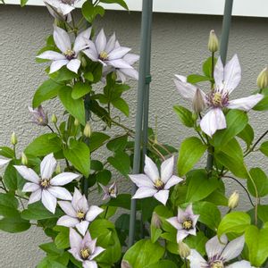 クレマチス サマリタン・ジョー つるはあまり伸びずコンパクトで 四季咲き性で花つきが良いです 花びらのエッジが紫色になります