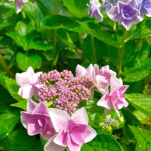 やっと咲いてきた😄 ガクアジサイコンペイトウ(だったはず?) ピンクと青が同居してます〜✨