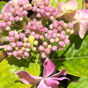 このピンクのガクアジサイ「コンペイトウ」は、青いコンペイトウの株と違って、ピンク一色で、ブルーが混じる素振りも見せない。 ブルーにピンクが混じった株は、ご先祖さまがピンクだったんだろうか。