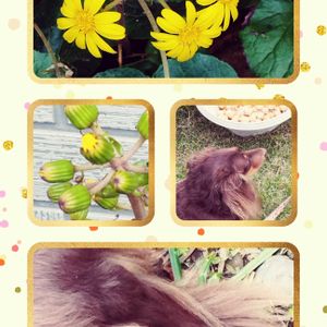 おはようございます🎀 ☁曇り ☔が降る 降らない? 🏡の北側 🟡色の花 銀杏とジュリ しっぽで庭の🧹そうじ ビビリちゃんで常に下向き🤭