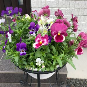 今日の玄関前担当🌼キョネンノパンジービオラと、何故か真ん中枯れてたんで金魚草植えたやつ 春先はヤバいなって感じでしたが、強い子だったらしく可愛くなってきたので玄関前に飾ったわよ(๑و•̀ω•́)و