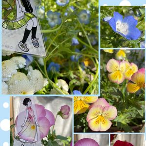 種から🌱よく咲くすみれ💛 ネモフィラ💙withお散歩ちゃん💗 好きな音楽聴きながら♫ 穏やかな時を過ごして*・゜゚♪・*:.。..。.♡ 素敵な春色のワンピもお似合い💗 今日の関東☀️帰りは強風🍃 穏やかなのはお散歩ちゃんの世界だけでした🌿