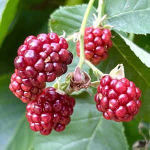 🍓ブラックペリー 果実はブルーベリーの約6倍のアントシアニンが含まれています。生食できますが農薬を使ってないため虫がいることもあります。 ⚫︎バラ科 キイチゴ属 ⚫︎原産 アメリカ中部 ⚫︎花期 5月〜6月 ⚫︎果期 7月〜8月