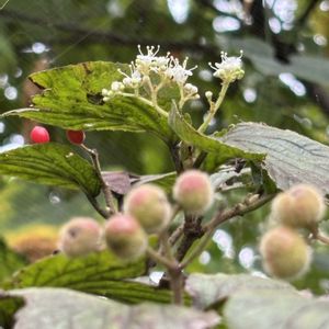マタタビ 花期に枝の上部の葉が白くなるが、それまで気が付かないのは困ったものだ‥ ドングリ型のは正常果💚 ゴツゴツしているのはマタタビミフクレフシというムシコブだが、生薬の木天蓼として珍重されるのはこちら(´ºωº`) 白く見えるのは、表皮と葉緑素を含む葉肉組織の間に空気が入って、光が乱反射する構造だからと言われている♡ 昨日のハンゲショウは花のすぐ下の葉が基部から白くなるけれど、マタタビはいろいろやね(^_-)