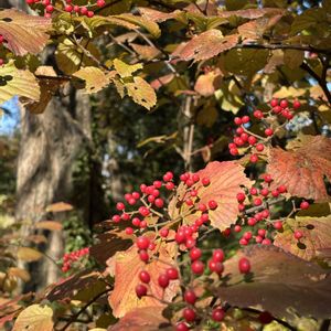手前から ガマズミの虫こぶ ガマズミミケフシ ガマズミの返り咲き 奥に2つガマズミの赤い実