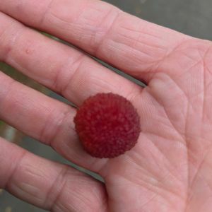我が家の野菜畑の隅に植えた山桃(ヤマモモ)❤️ 緑から、橙、赤と、熟して美味しそうな実が、 一塊になり、熟していく過程がよくわかる見本のようです