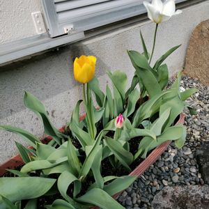 去年のチューリップの球根がたくさんあったので埋めてみたら3つ花がでました。 ほとんど葉っぱばかりで、来年どうするか悩むところです。