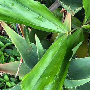 アロエの間から伸びたのは、きっとヤシの木。連日の雨で立派になりました。 早目に移してあげます。