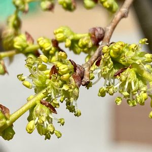 【われら樹木探検隊】 🌿ケヤキ🌿欅 2️⃣ 昨日は芽吹いたばかりのケヤキをご覧いただきました🌱 今日はそれから8日後に咲き始めたおばなをご覧ください。 ケヤキの花は雌雄同株。 葉の展開と同時にとても地味な花が咲きます。 芽吹いた新枝の下部におばなが数個ずつ集まってつき、めばなは上部(枝先)の葉腋にふつう1個ずつつきます(これには写っていません) この写真はおばなです🌼 おばなには、4〜6裂する花被と4〜6個のおしべがあります。 まだつぼみのものや、開いておしべが飛び出し、花粉を飛ばしたものもあります。 おばなとめばなが離れているためピントが合わず、一緒には撮れませんでした😭🤳 という訳で、明日はめばなを投稿予定です。 2023.3.29撮影