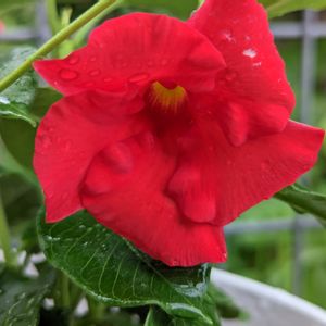 クライミングサンパラソルフリルレッドに初めての花が咲きました。鮮やかな赤です。 まるでバラ🌹 大輪系のレッドとホワイトもすくすく成長中です❤