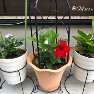 クライミングサンパラソル🌺✨ 大輪レッド2輪咲きました🎶 小さなツボミが4つ位あるので楽しみ〜💕 ツルも伸びて来たのでオベリスク設置👍 どんどん育っておくれ〜 中輪のフリルレッドもツボミが見えました😊 サントリーさん…ごめんなさい🙇♀️ 少し前の暴風でタグ🏷が一つ飛んで行ってしまいました😢 お花が飛ばなくて良かったワ😅 たまに液肥をあげてます。 乾き気味が良いそうなので鉢を持ち上げて確認して軽くなったらタップリ水やりしてます。 軽い培養土なので移動も楽チン♪ 雨の日は軒下に💖