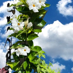 クライミングサンパラソル♡ モニター当選の白いお花もここに来て 一斉に咲き出しました。 行灯仕立てではなく、オベリスクに絡ませてるので かなり高い所まで伸びたツルをUターンさせたら いい感じなりました😊