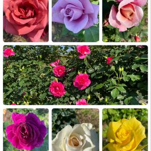 今日の薔薇畑🌹 ↖️黄色い薔薇からフリージア ➡️ピンクアイスバーク ⬇️ツルクリスチャンディオール ⬅️サイレントラブ ⬅️シャルルドゥゴール ⬇️アイスバーク ➡️アカペラ 主人の薔薇畑華やかになって来ました💛💕❤️💗💜🤍💞