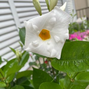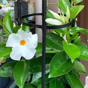 ✨🤍クライミングサンパラソル🤍✨ ホワイト クライミングと言うのでツルがどんどん出てグングン伸びていくと思っていましたら、 ゆっくり伸びています。 お花の開花ものんびりさん😅 蕾は沢山付いていますが、なかなか開かなくて待ち遠しかったです😌💓 真っ白の花びらと中心の黄色で素敵です❣️ 横のトレリスに沢山の巻きついて沢山咲いてくれます様に🙏💕
