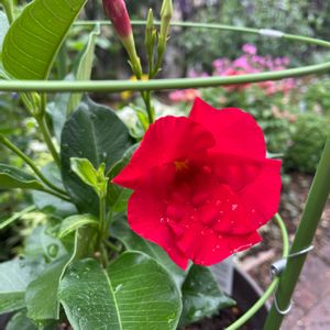 クライミングサンパラソル フリルレッド❤️ 高さは、変わらず蕾が増えてきました✨ 上品なフリルが、可愛いですね〜 マンデビラは、乾燥に強い花なので 加湿にならないようにしています。
