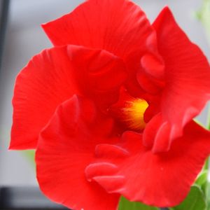 【アンバサダー便り】クライミングサンパラソル フリルレッド。植えて4週間で、トロピカルな雰囲気の真っ赤なお花が咲きました!