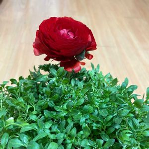 7:30 ☀️ 外気温13℃ ラナンキュラスの蕾が3つ出てきました! 赤いお花も真紅で目が覚めます🌹 花弁ヒラヒラたくさんでかわいいな〜 満開が楽しみ〜🥰 下の葉は、スーパーアリッサムスノープリンセスです(花なし)