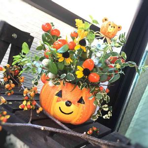 玄関のハロウィン飾りと今日が作ったブーケ