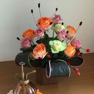再投稿! 納得いかなくて葉っぱをドラセナに 替えてみた。 つぼみだったバラも開き始めいい感じ
