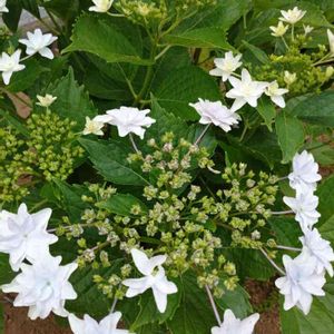 ✨スミダノハナビ✨ 輝くほど白いガクアジサイ🤍(*´꒳`*) 花は、中心に小さな花が固まって咲き、 その周りを囲むように10個~16個の装飾花が咲きます。 装飾花は中心の花よりも大きく、八重に咲き軸が少し長いため、まるで花火が打ちあがり開いたように見えます。 中央の小花から花粉が出にくいので花自体が汚れにくく傷みにくいため、花もちがとても良いのが魅力です。 葉はアジサイらしい、縁にぎざぎざの入った濃い緑色の葉です。 濃い色の葉と、繊細な作りの白い花のコントラストが見事です。