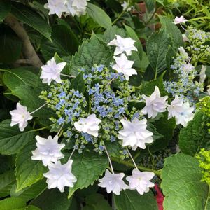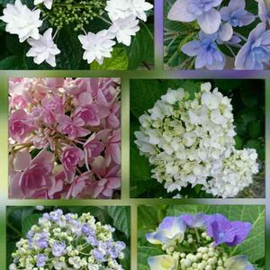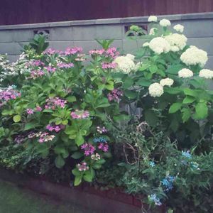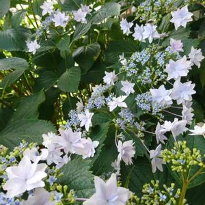 母の庭で咲いているアジサイ達 右下の七段花の葉が汚く、花も淋しい😥