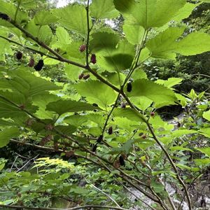 ヤマグワの実が美味しそうに熟して来ました🟠🔴⚫🌿 毛虫のような毛は雌蕊の柱頭で、食べるとモソモソした感じがします、マグワの実よりも甘いです。 ヤマグワは日本在来種で、中国産のマグワと共に養蚕の為に使われました、クワというとこのヤマグワを言う事が多いそうです。 クワ科 クワ属
