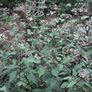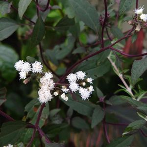ガーデナーさんの事務所の庭で 素敵な西洋フジバカマに出会いました ユーパトリウム・チョコレート 葉の先端と茎がチョコレート色っぽいです 和名)銅葉フジバカマ 地味だけど小さな白い花がモコモコしてかわいい💟