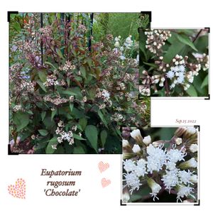 「ユーパトリウム チョコレート」 マルバフジバカマの園芸品種、 葉っぱが チョコレート🍫色で 小さな白い花が 可愛い〜です❣️ 8月初め頃からポツポツと 咲き始めました☺️ 今、 満開です🤗 長〜く咲いてる いい子です💕🎶