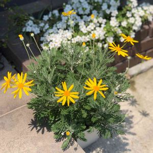 昨年の今頃 『黄色のお花が咲くよ〜』と お友達からもらった苗🌼 途中、トラブル発生😱 名前もわからず困ったけど ダメもとで株元5㎝位残して✂️ 見事復活❣️こんなに可愛いく 咲いてくれました😍 お花が咲いたので 教えてカメラで ユリオプスデージーと 教えてもらいました🌼😊