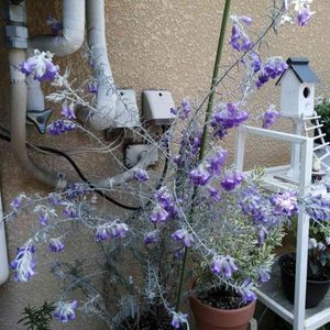 エレモちゃん💜あばれる君状態🤣 昨年春に寄せ植えで使ってた子を おひとり様にしたんやけど 切り戻しとかしてないから伸び放題!好き放題! でもキレイにお花咲いてます😁 今年はちょっと切ってみよう✂️ (背景がちょっとアレなんやけど…)