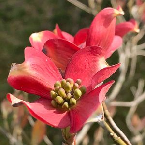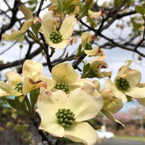 近くの広場で咲き始めた 白いハナミズキの花です🎵