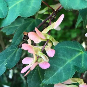 4月に咲いていたウリカエデの花が こんな実になっていました。 ほんのりとピンクに色づいて 印象的でした🎵