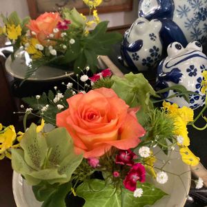 いつもの方から又 ミニ生花を頂きました 今回は少し大きい器に 生けてあります フンワリとしたピンクのバラが 色んなお花に見えてきます 🌿🌸🌸🌿 🌿🌸🌸🌿 🌿🌿🌿 毎回何かホッとし 癒せます💓 リビングに飾りました🍷🍾